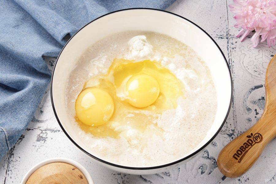 Соедините творог, яйца, соль и оставшийся сахар. Добавьте дрожжевую смесь.
