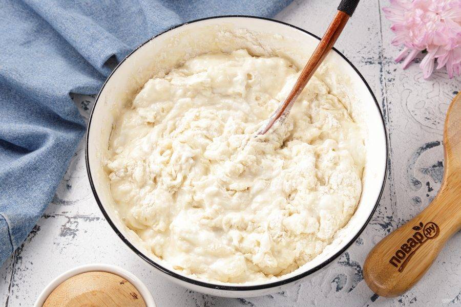 Перемешайте и частями добавьте муку. Муки может уйти чуть больше, или меньше, чем указанно в рецепте. Не забивайте тесто сильно мукой, оно должно получиться мягкое и немного липкое.