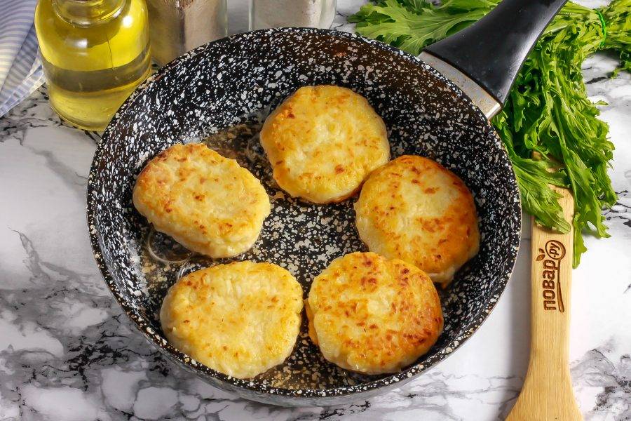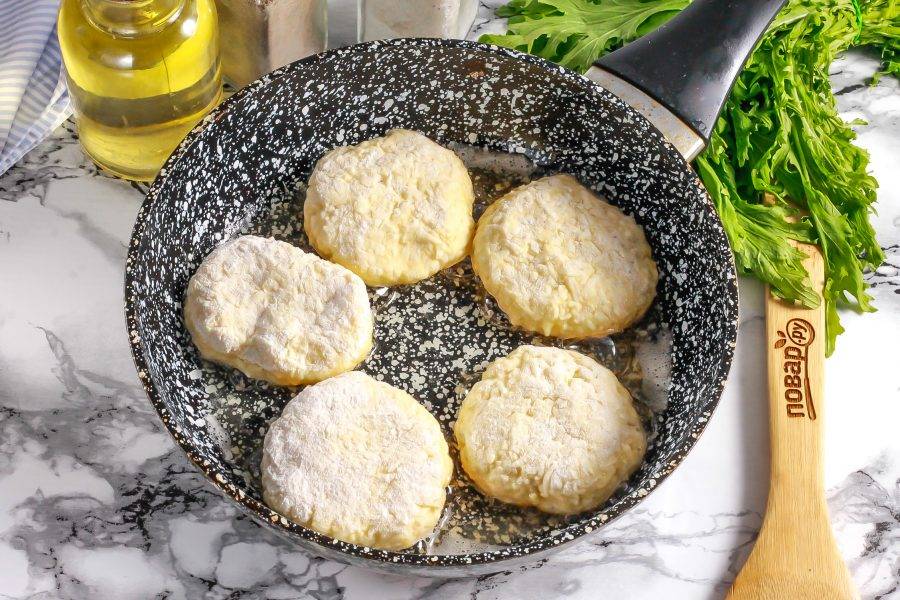 Прогрейте в сковороде растительное масло и выложите в него заготовки сырников. Сразу же убавьте нагрев до умеренного и обжарьте сырники примерно по 2-3 минуты с каждой стороны до румяности.