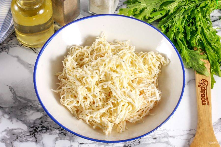 Очистите сырки от фольги и натрите на терке с мелкими ячейками в глубокую тарелку.