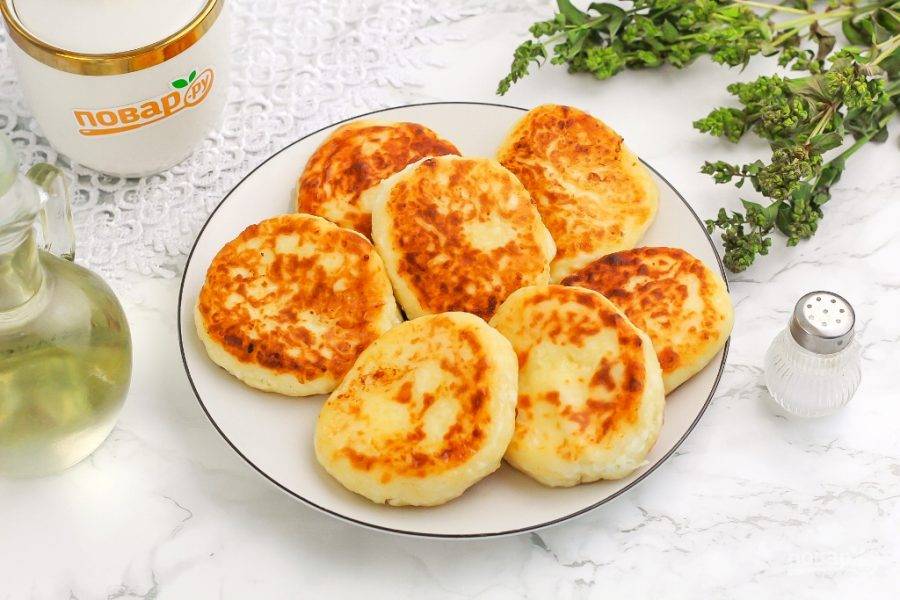 Выложите сырники на тарелку и дайте слегка остыть. Таким же образом обжарьте и остальные заготовки.