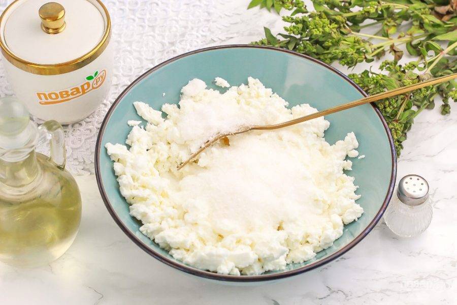 Выложите творог в глубокую емкость и тщательно протрите вилкой, чтобы он стал однородным. Всыпьте соль и сахарный песок, ванильный сахар.