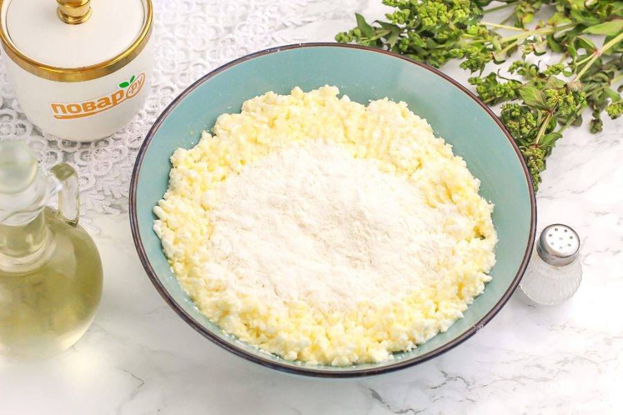 Всыпьте половину пшеничной муки высшего сорта и тщательно вмешайте ее в емкость, чтобы масса стала более пластичной и можно было вылепить сырники.