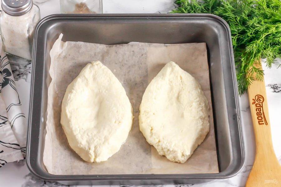 Выложите в форму пергаментную бумагу и смажьте ее растительным маслом. Смочите руки в воде и сформируйте небольшие лепешки в виде лодочек. Выложите в форму на расстоянии друг от друга.