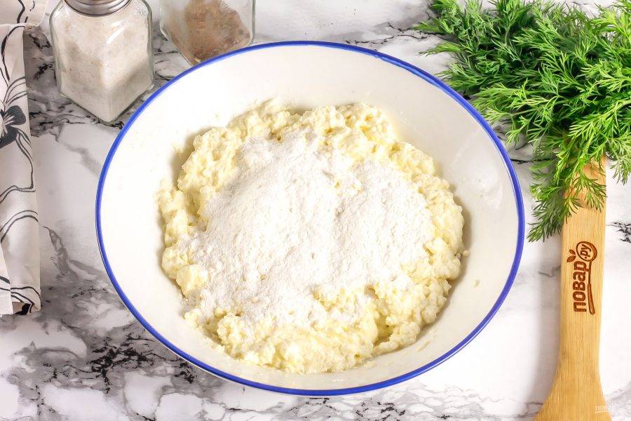 Всыпьте пшеничную муку и еще раз все тщательно перемешайте. Масса не должна получиться слишком плотной. Она должна быть такой, как на сырники.