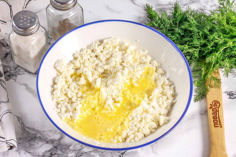 Творог выложите в глубокую емкость и всыпьте соль. Взбейте в отдельной емкости куриное яйцо и отделите часть массы для смазывания сырников. Остальное влейте в творог. Тщательно все перемешайте, разминая творог вилкой.