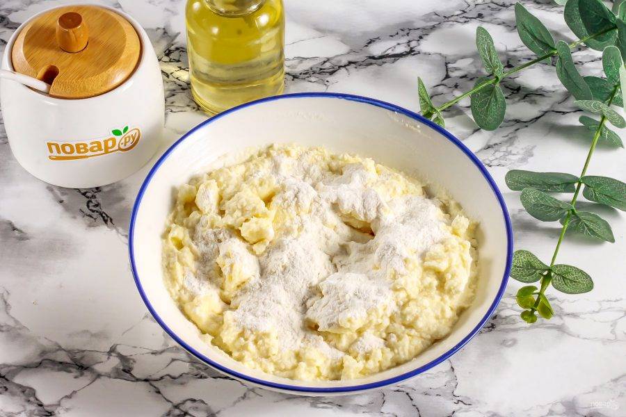Всыпьте половину пшеничной муки и тщательно перемешайте все, создавая творожное тесто.