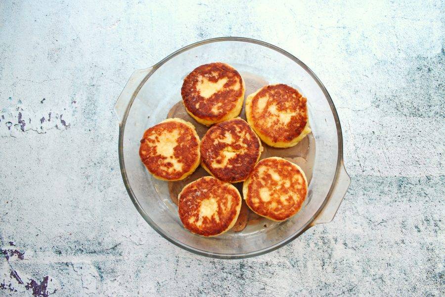 Переложите сырники в форму для запекания и поставьте в горячую духовку. Доведите до готовности в течение 4-5 минут при температуре 180 градусов.