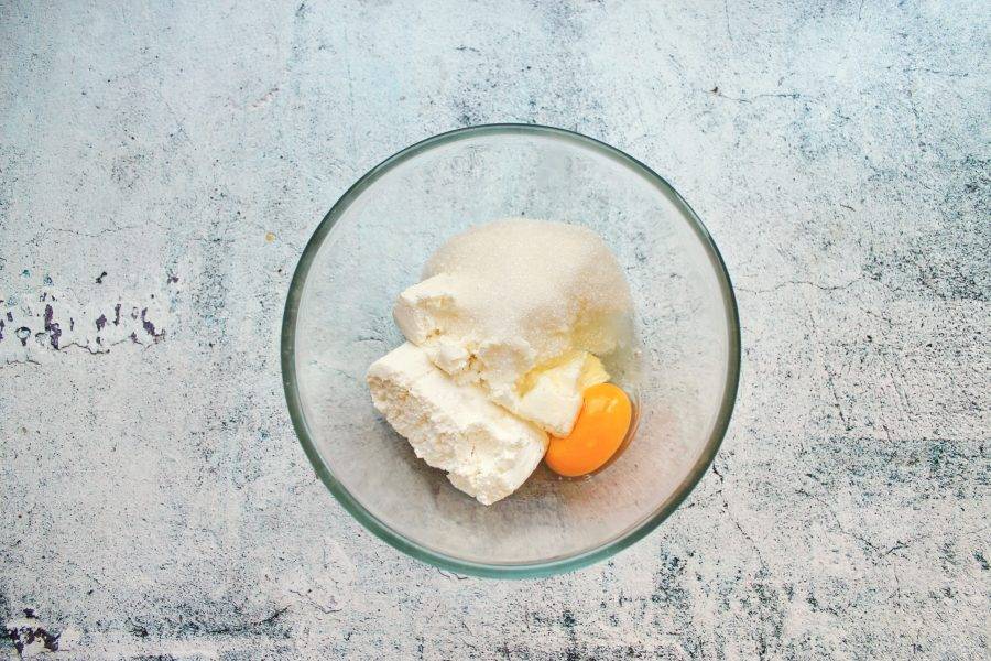 В миску выложите творог и разбейте яйцо, всыпьте сахар.