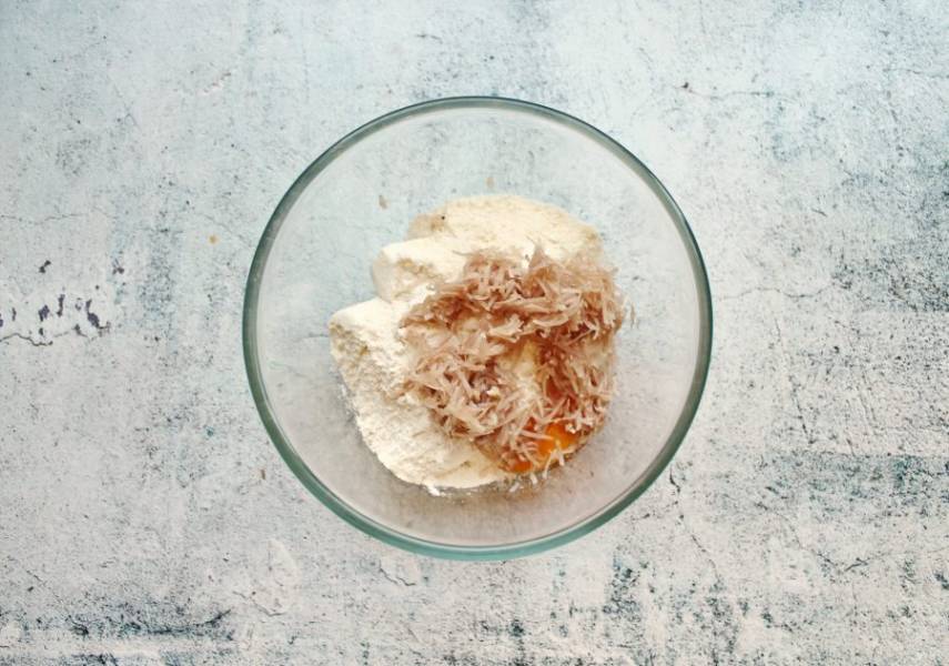 Оба вида муки смешайте с разрыхлителем, мукой и добавьте в миску с творогом. Топинамбур очистите от кожуры и натрите на мелкой терке.