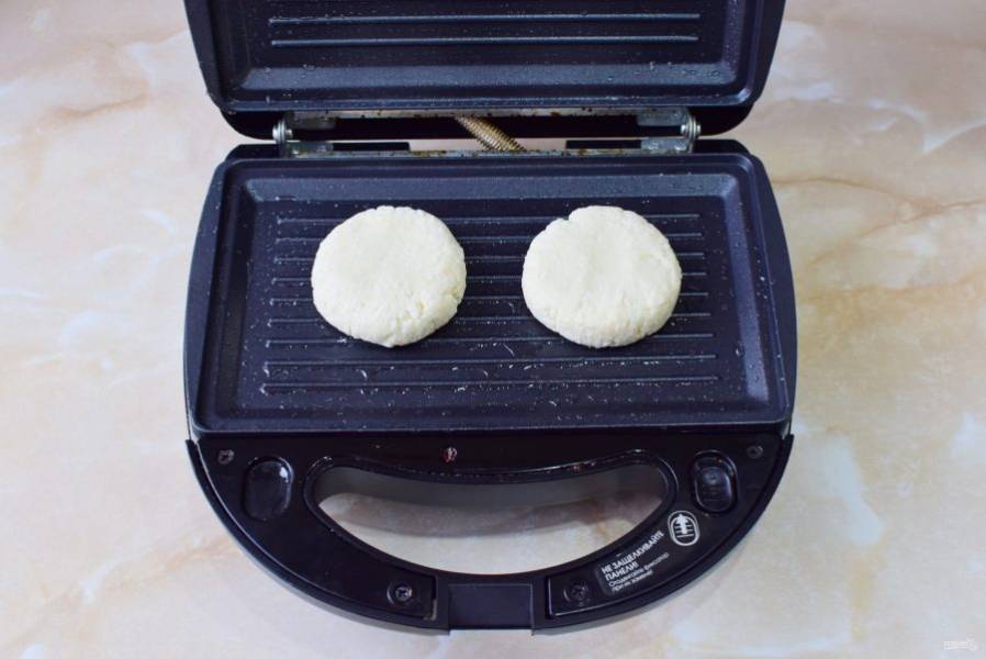Мультипекарь разогрейте до горячего состояния. Перед первой порцией смажьте растительным маслом и выложите два сырника. Закройте крышку и готовьте 4-6 минут. Ориентируйтесь по своей технике.