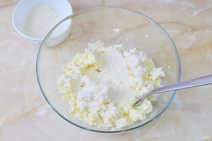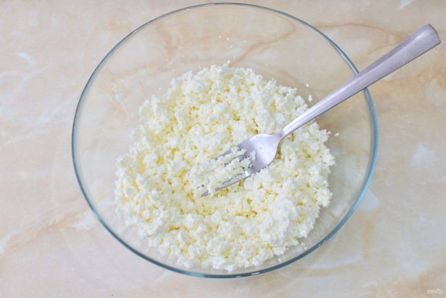 В чашу выложите творог. Если есть необходимость, то разомните его вилкой для более однородной консистенции. Можно протереть через сито.