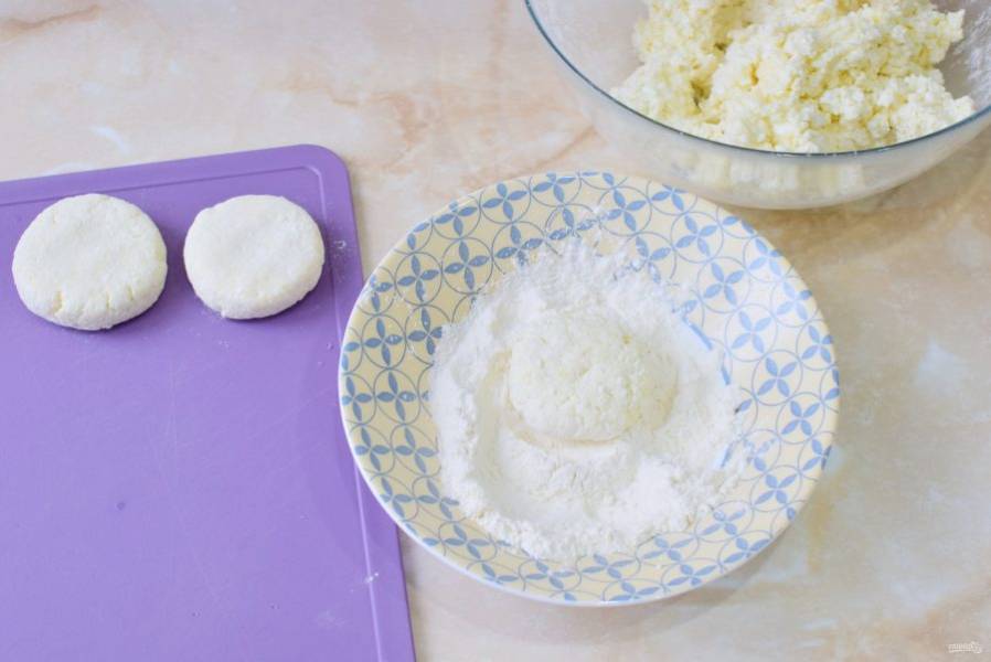 Руками формируйте небольшие сырники и обваливайте их в муке. Учитывайте, что они увеличатся в размере при выпекании.