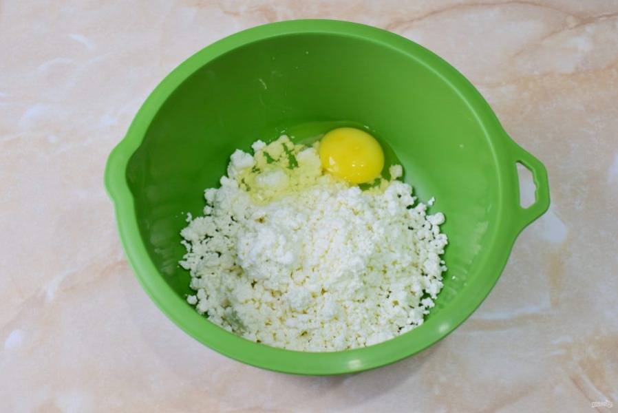 В чашу выложите творог и добавьте к нему яйцо. Смешайте.