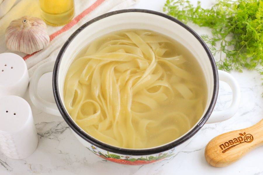 Прогрейте в кастрюле или ковше воду до кипения, всыпьте в нее щепотку соли и выложите пасту любого вида. Отварите примерно 10 минут и выключите нагрев. Оставьте пока пасту в бульоне, чтобы она не слиплась.