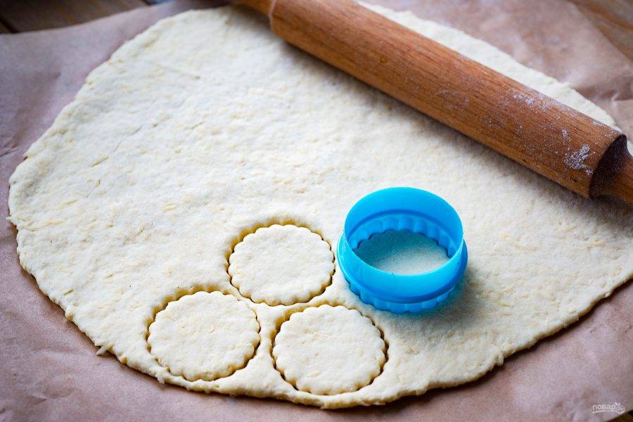 Затем немного припылите рабочую поверхность мукой и раскатайте на ней тесто в пласт толщиной примерно в 3-4 мм. Вырубите фигурной вырубкой заготовки будущего печенья.