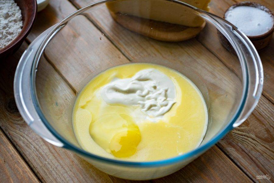 Растопите масло сливочное в сотейнике на маленьком огне, немного охладите его и влейте в просторную миску. Добавьте к нему яйцо и сметану.