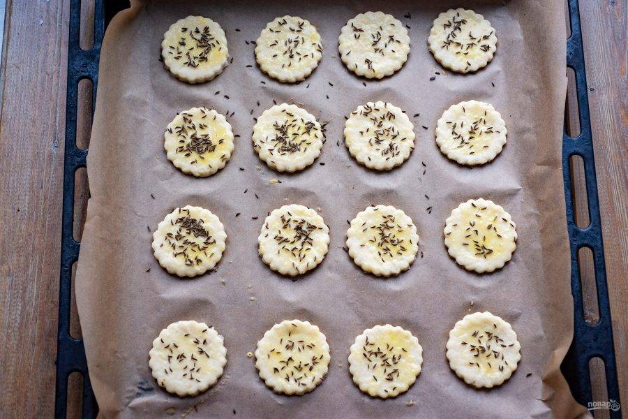 Противень застелите бумагой для выпечки и выложите все заготовки будущего печенье. Взболтанным яичным желтком с помощью силиконовой кисти смажьте каждую заготовку и присыпьте тмином. Выпекайте печенье в уже разогретой до 180 градусов духовке в течение 20 минут.