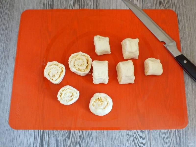 Рулет нарежьте на кусочки толщиной 2-3 см. Каждый кусочек слегка придавите.