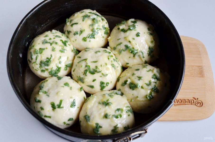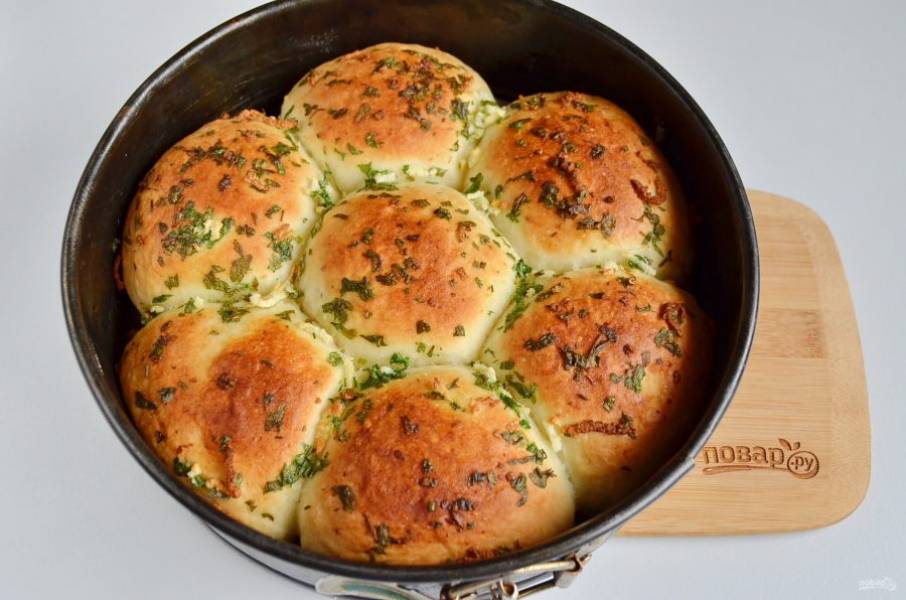 Каждую булочку смажьте сливочно-чесночной смесью. Отправьте форму в духовку на 20-25 минут. Температура - 220 градусов.