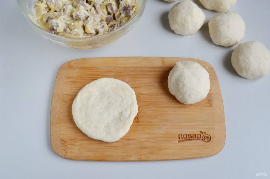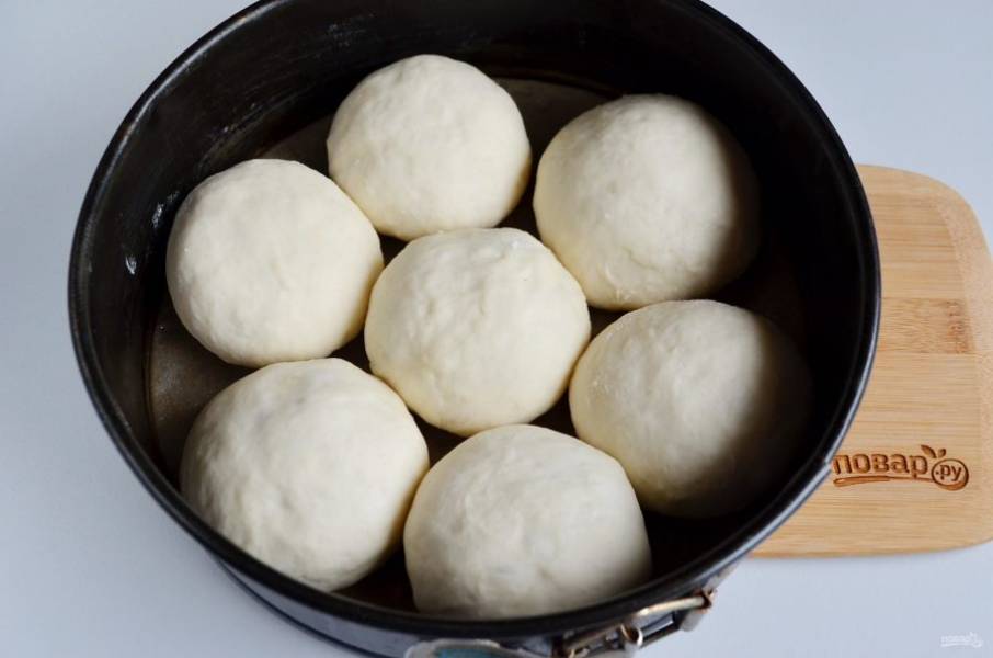 Разделите тесто на части, их количество зависит от желаемого размера булочек. Я поделила на 7 частей, для моей формы это оптимальное число. Каждый шарик пальцами расплющите на столе.