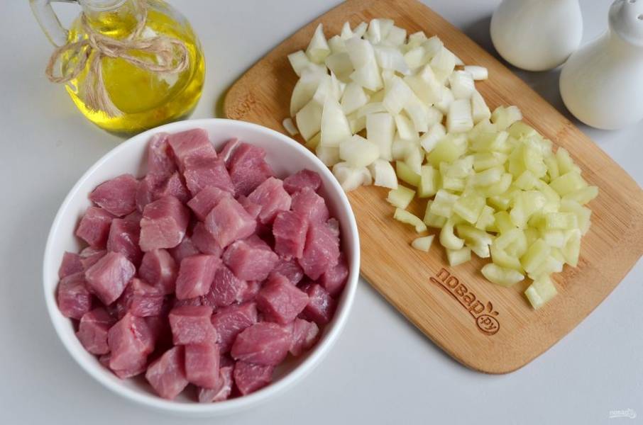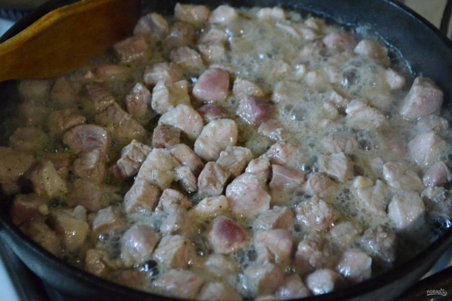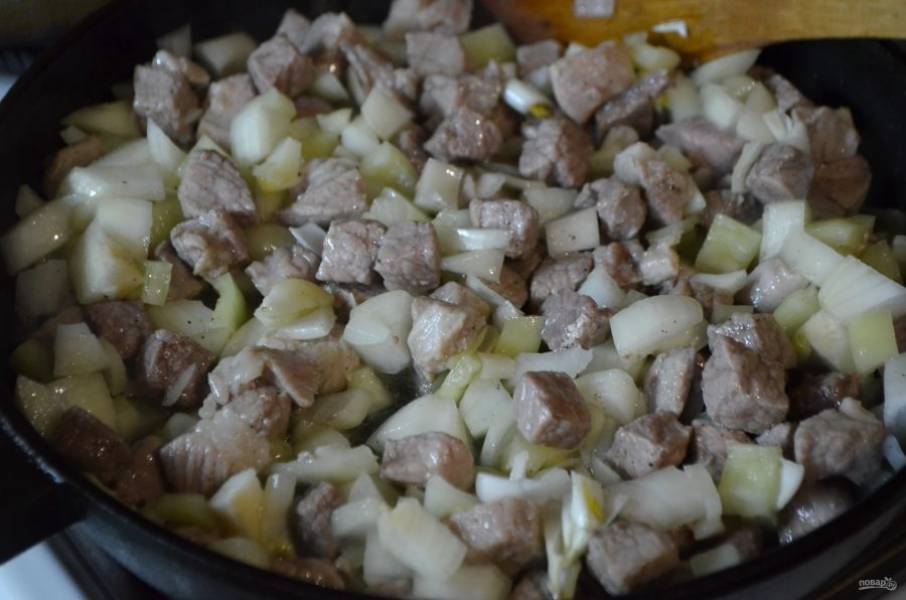 На трех столовых ложках масла обжарьте мясо несколько минут, огонь сильный.