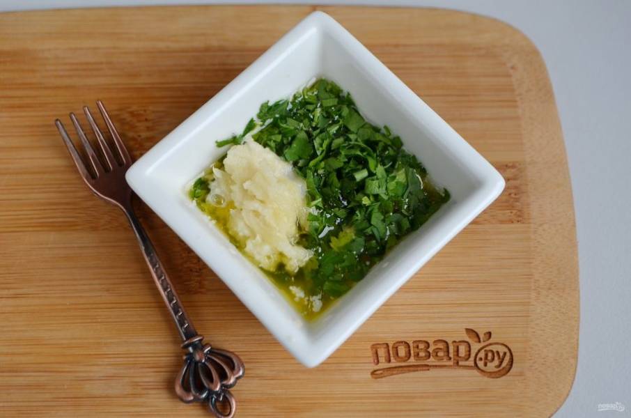 Растопите сливочное масло, добавьте к нему щепотку соли, порезанную петрушку и чеснок. Перемешайте.