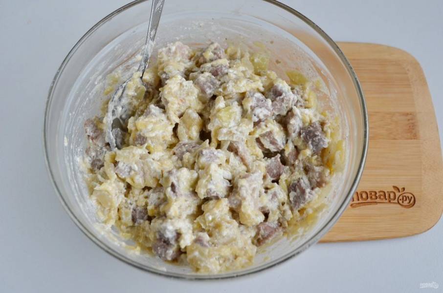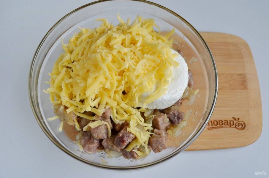 Остудите немного мясо с овощами, добавьте к нему оба сыра и перемешайте начинку для булочек.