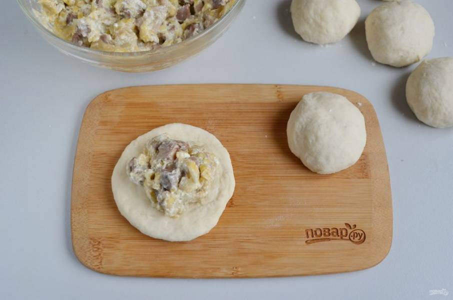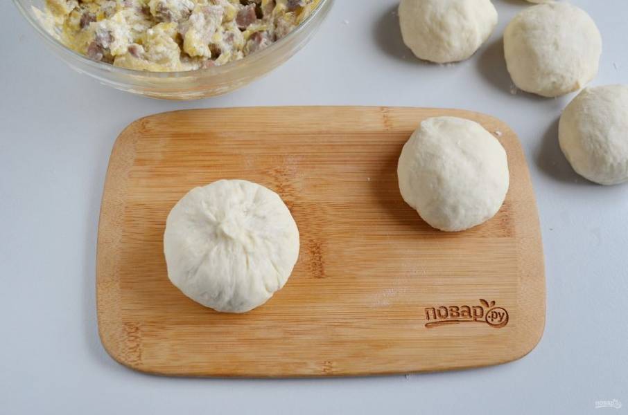Соберите тесто в комочек и хорошо скрепите, чтобы начинка была надежно заключена внутри булочки.