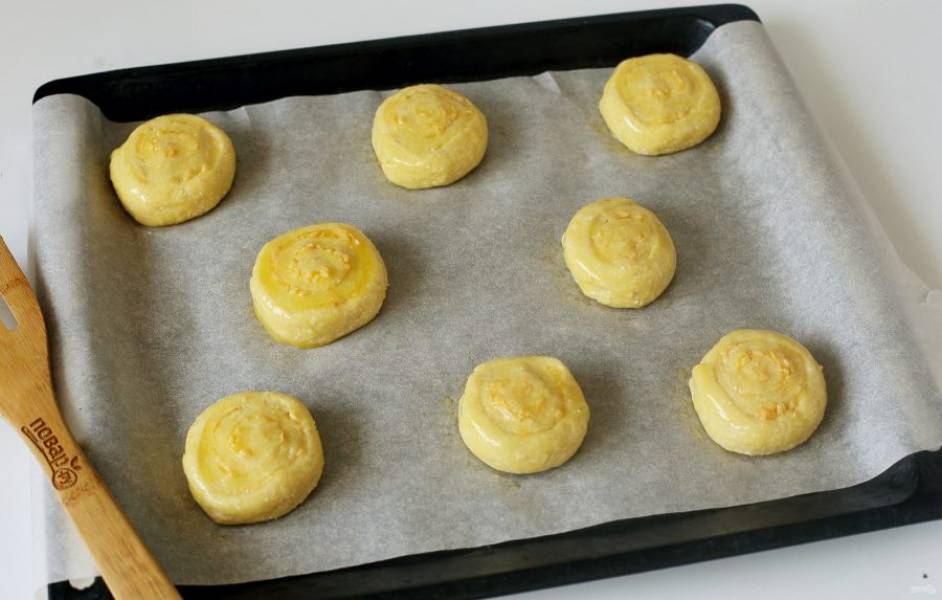 Переложите кусочки срезом вниз, на застеленный пергаментом противень. Верх смажьте яичным желтком и выпекайте изделия в духовке при температуре 190 градусов около 20 минут.