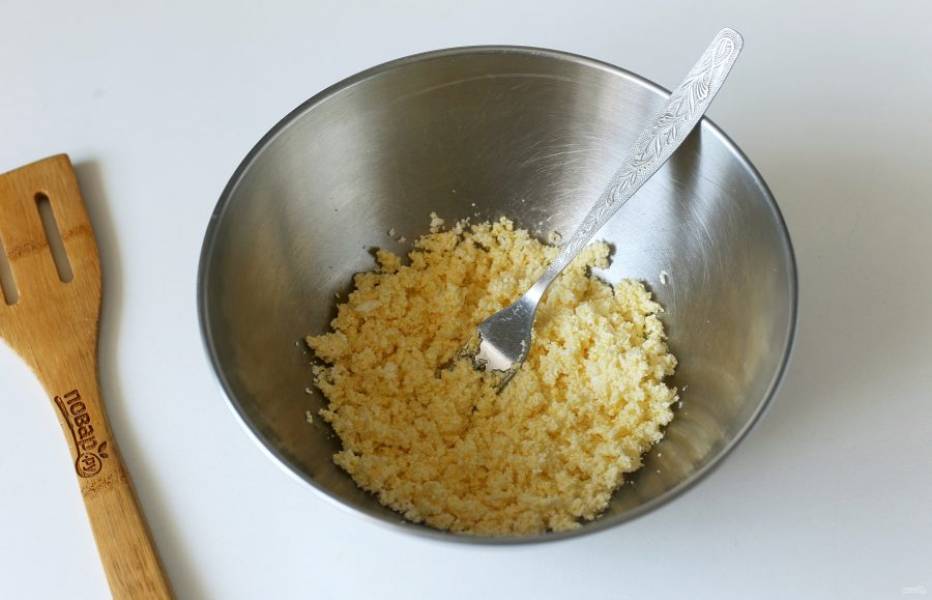 Соедините творог, яйцо и масло. Перетрите все хорошо вилкой или измельчите блендером.