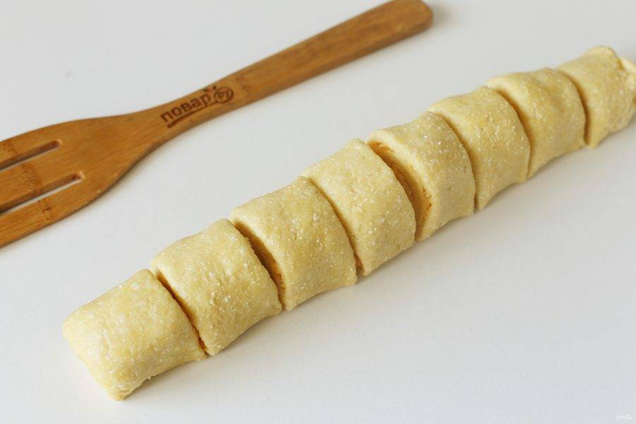 Заверните тесто в рулет и нарежьте на кусочки, шириной около 2-3 см.