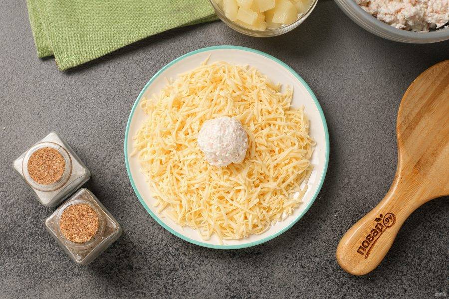 Сыр натрите на мелкой тёрке. Руками возьмите немного готовой массы, в центр выложите кусочек ананаса и сформируйте шарик. Обваляйте поочерёдно шарики в сыре.