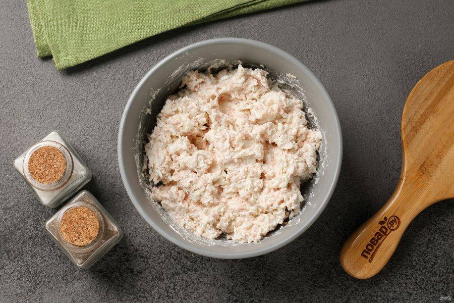 Затем добавьте творожный сыр и хорошо всё перемешайте.