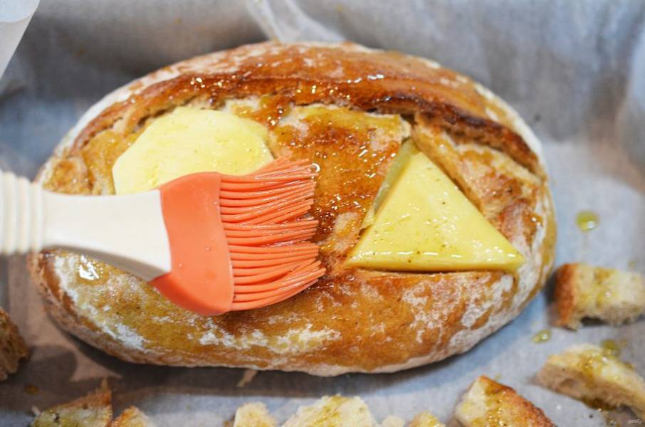 Смешайте масло с приправами и смажьте хлеб, сыр и полоски хлеба.