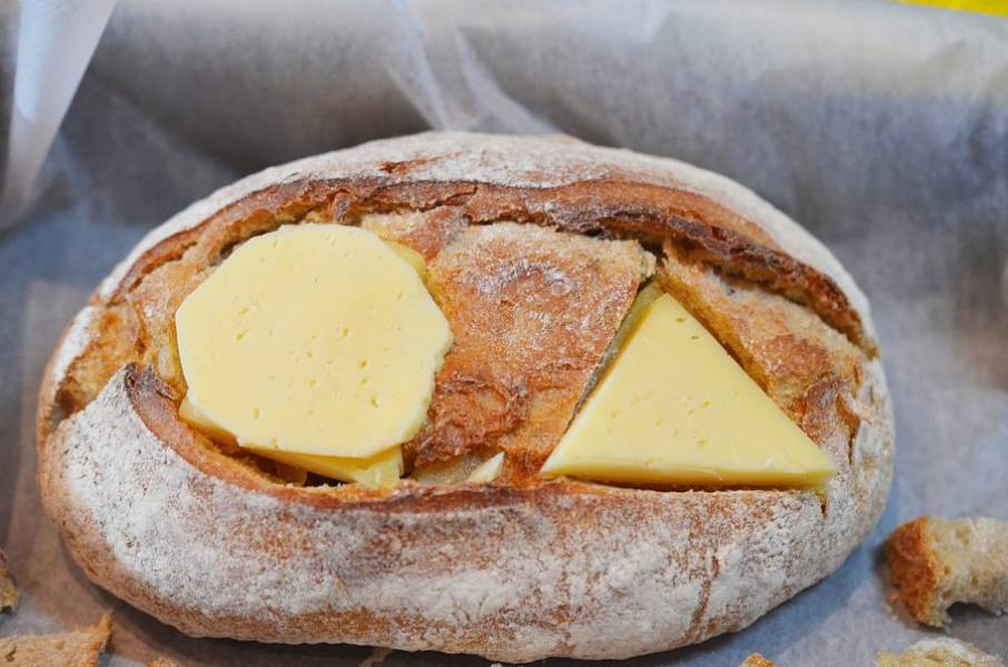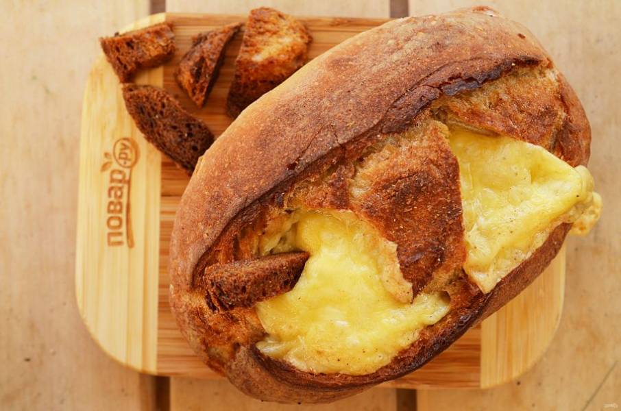 А я прям вырезала всю середину и уложила три вида сыра ломтиками, а оставшийся хлеб подсушила на сухой сковороде и потом макали в сыр