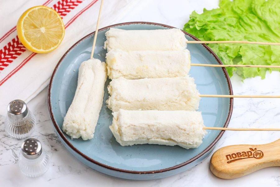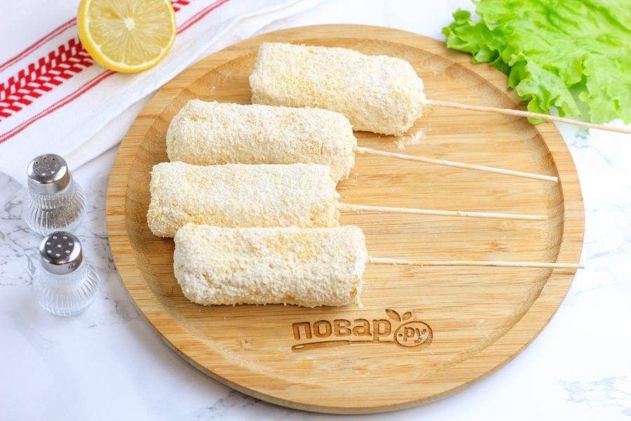 Взбейте в миске куриные яйца с солью и обмакните каждый брусок сыра на шпажке. Затем быстро закрутите на нем раскатанный хлебный мякиш и прижмите руками со всех сторон. Благодаря взбитым яйцам мякиш отлично зафиксируется на сыре.