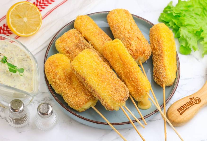 Аппетитный и румяный корн-дог с удовольствием съедят дети — они обожают такой фаст-фуд! Подавайте его горячим, чтобы сыр тянулся и не забудьте про соусы: чесночный, тар-тар, кетчуп, барбекю и т.д.
