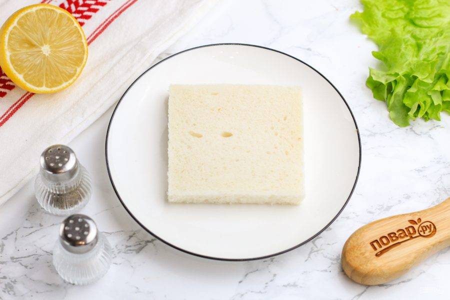 Каждый ломтик тостового хлеба выложите на доску и обрежьте на нем румяные корочки, оставляя лишь мякиш.