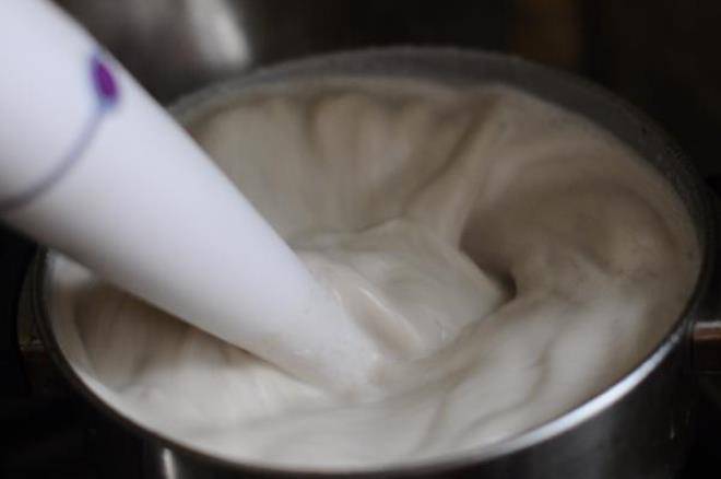 Когда сыр начнет плавиться, добавьте в суп мускатный орех, соль по вкусу, сливки и снова взбейте блендером. Доведите до кипения.