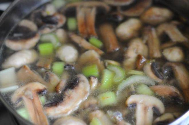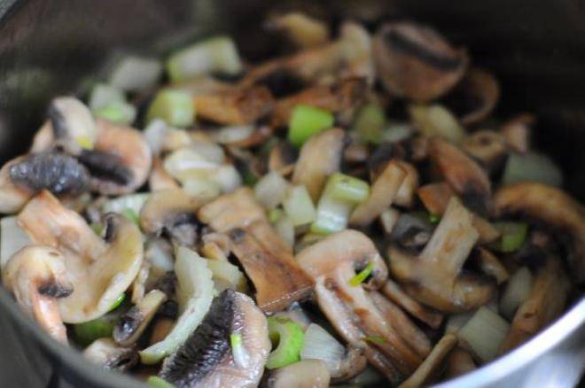 Шампиньоны, лук и сельдерей порежьте небольшими кубиками.