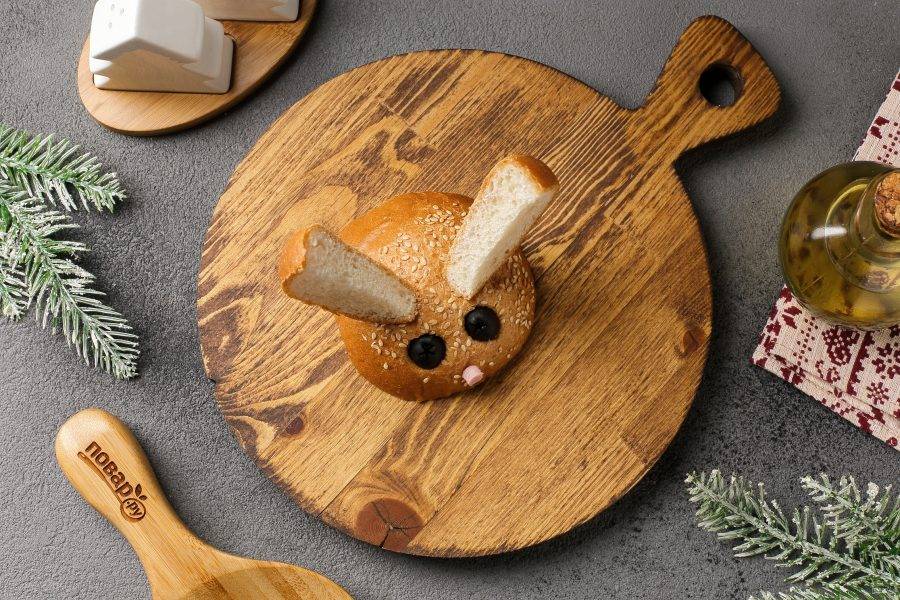 При помощи зубочисток прикрепите ушки на верхнюю часть булочки. Из маслин сделайте глазки. Кружочек колбасы прикрепите так же зубочисткой, это будет носик кролика.
