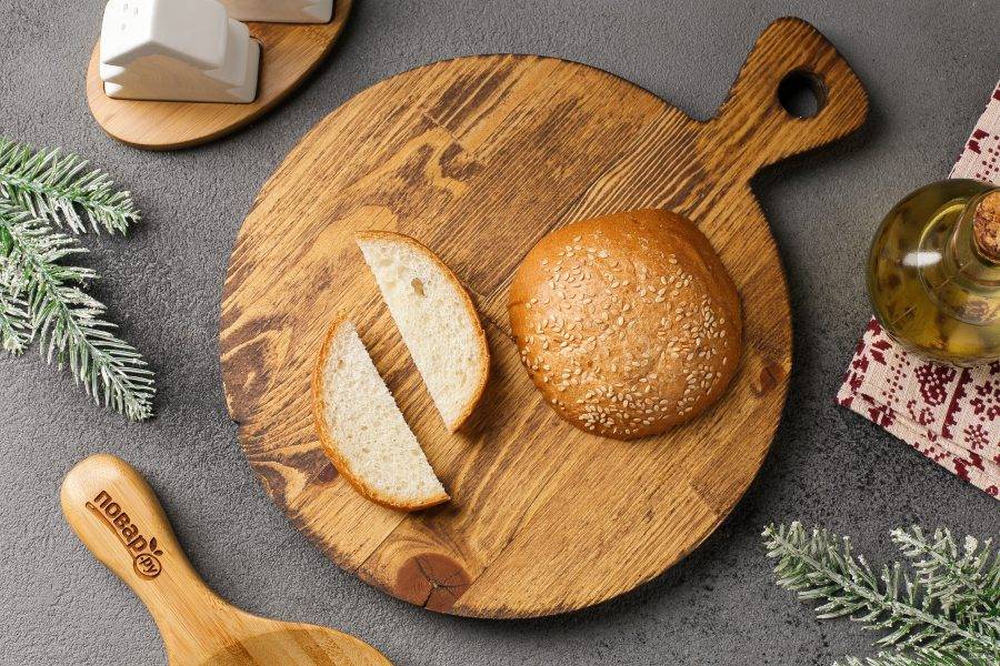 Булочку для гамбургеров разрежьте пополам. Из нижней части вырежьте ушки для кролика.