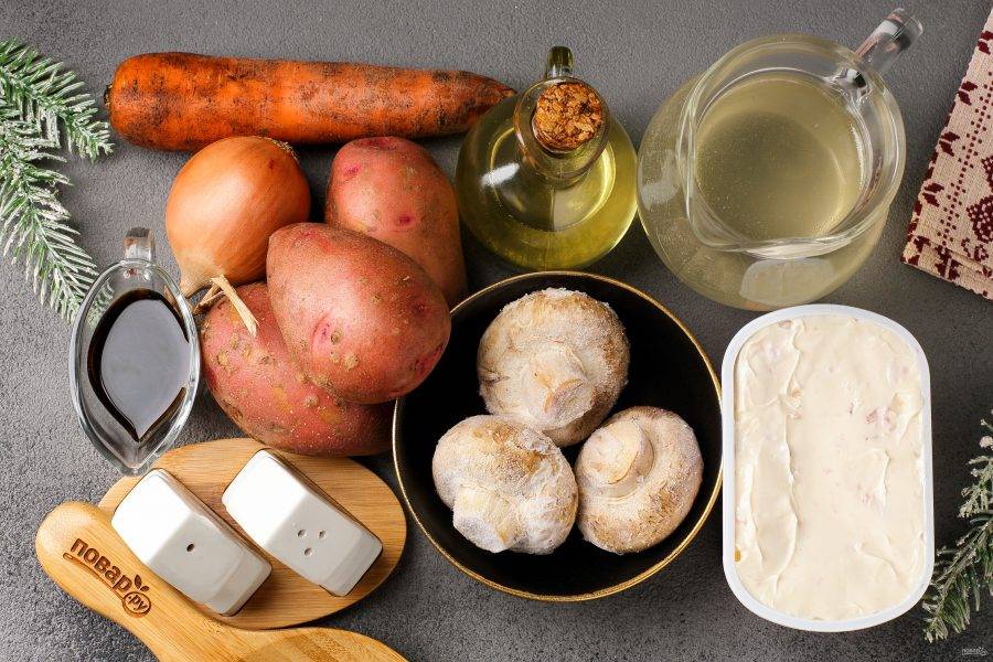 Подготовьте все ингредиенты для супа. У меня плавленый сыр с ветчиной, но можно взять самый простой без добавок. Бульон я буду использовать куриный, но вы можете взять любой другой или вовсе заменить его на воду.