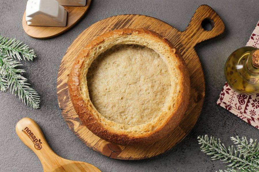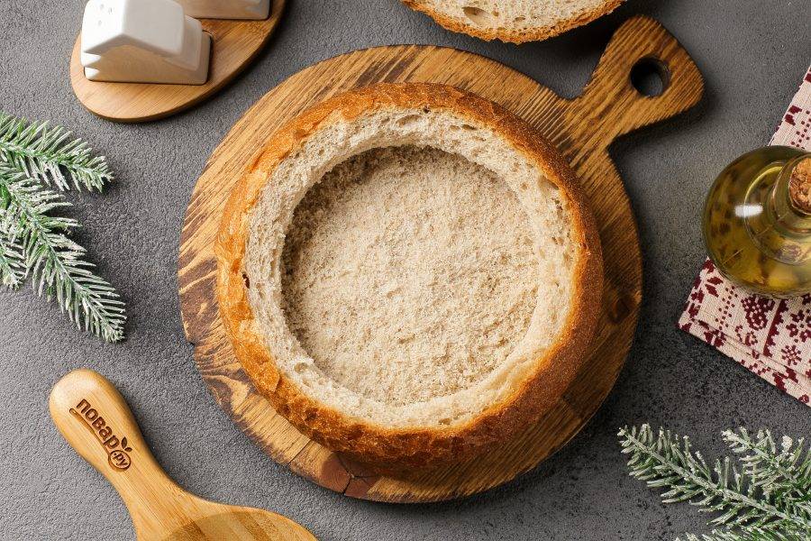 Срежьте у хлеба верхушку и извлеките хлебный мякиш. Оставьте небольшой слой по бокам и на дне, примерно в 1 см.
