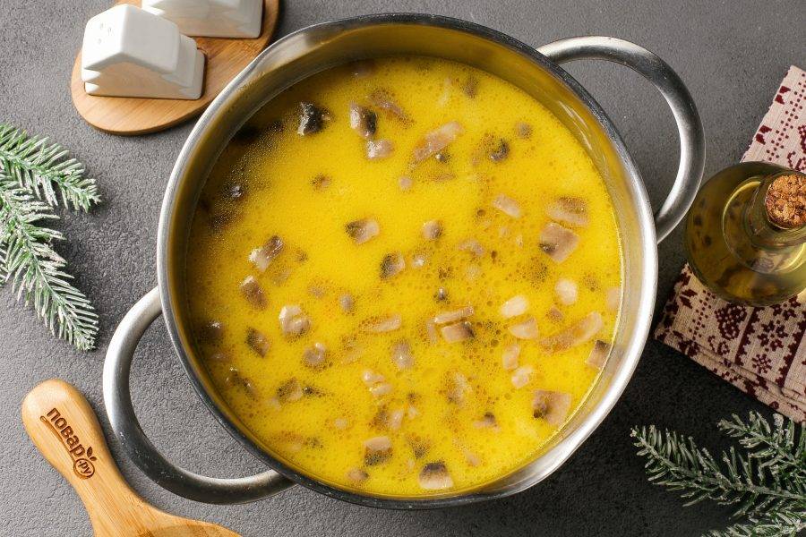 Когда картофель будет готов, добавьте плавленый сыр, соль и молотый перец по вкусу. Варите ещё пару минут после чего всё взбейте блендером.