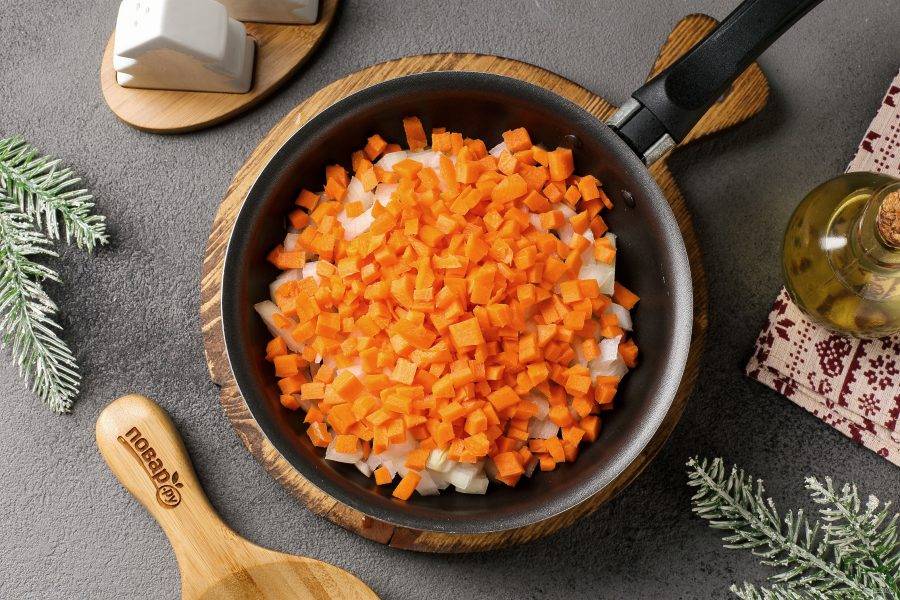 Лук и морковь нарежьте кубиками и переложите в разогретую сковороду с маслом. Обжарьте овощи до мягкости.