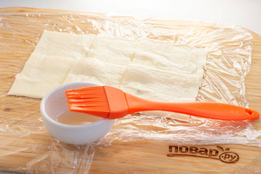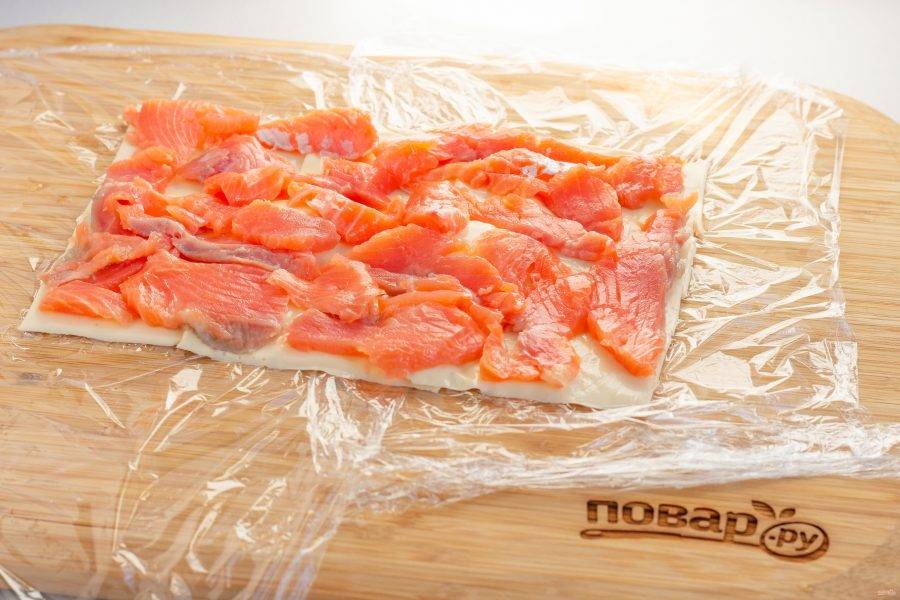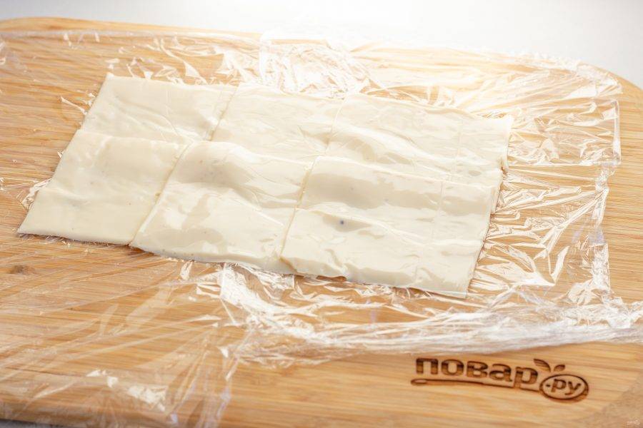 Досочку застелите пищевой пленкой. На пленку выложите внахлест пластины сыра в виде прямоугольника.