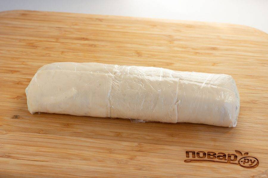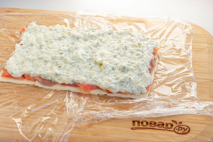 Аккуратно сверните рулет по длинной стороне, заверните его в пищевую пленку со всех сторон и уберите на 2-2,5 ч. в холодильник. Если скоро подавать к столу, то можно на 30-40 минут в морозильную камеру.
