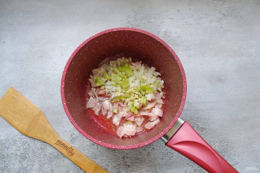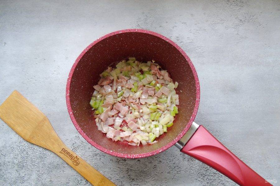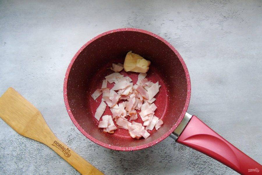 Бекон мелко нарежьте и выложите в кастрюлю с кусочком сливочного масла. Обжаривайте 3-4 минуты.